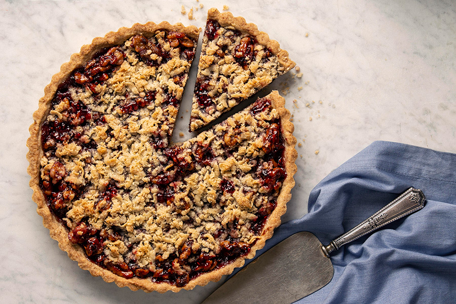 タルト生地にもフィリングにも香ばしいくるみがたっぷり!甘酸っぱいラズベリージャムとくるみの風味豊かな味わいが口いっぱいに広がる至福のスイーツです。ゆったりおうちで過ごす午後のティータイムにどうぞ。